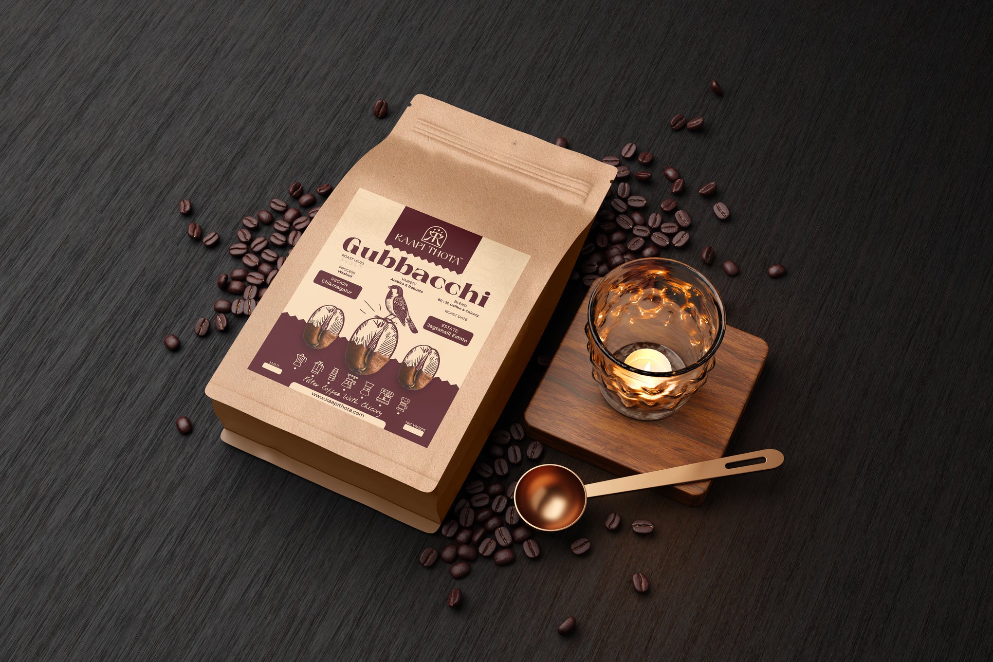 Introducing GUBBACCHI Blend, a unique blend of South Indian filter coffee and chicory sourced from the renowned coffee growing region of Chikmagalur. This special blend is made with an 80:20 ratio of coffee to chicory, resulting in a bold and rich flavor profile. The beans are grown at an elevation of 1250m, adding a unique complexity to the taste. The medium-dark roast brings out the perfect balance of sweetness and acidity, leaving a smooth finish on the palate. Enjoy a taste of tradition with GUBBACCHI Blend, perfect for coffee connoisseurs and fans of South Indian filter coffee.